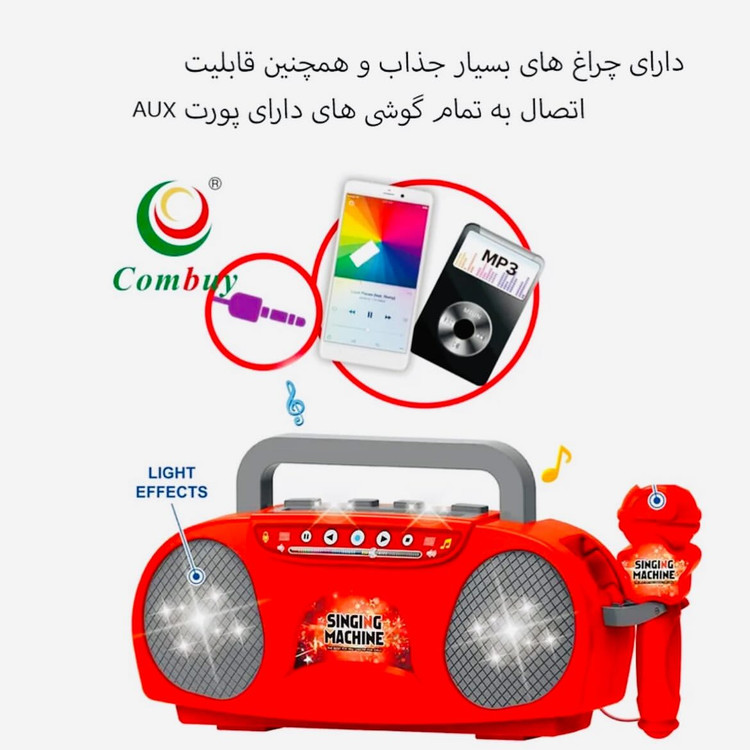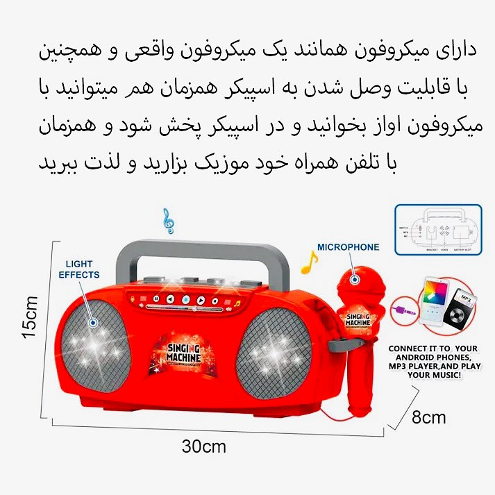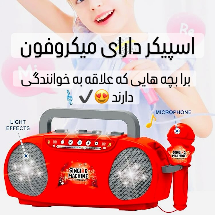 این پست برا بچه هایی هست که به خوانندگی علاقه دارند این محصول بسیار آموزنده هست وخلاقیت کودکان را به کار میکشه مشخصات محصول: _دارای میکروفون با سیم که مانند یک میکروفون واقعی کار میکند _این اسپیکر زمانی که باتری درون آن قرار می دهید فقط چراغ های آن روشن میشود و فقط با اتصال میکروفون به اسپیکر یا تلفن همراه به اسپیکر کار میکند و صدا پخش میکند _دارای رقص نور و صدای بسیار بلند که کودکان را غافلگیر میکند